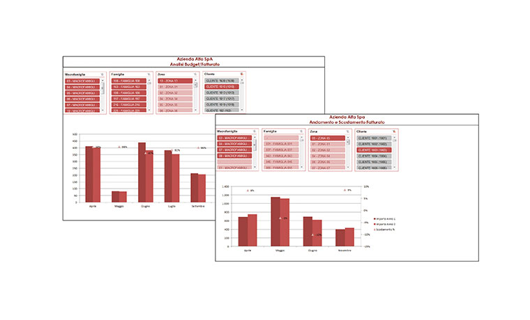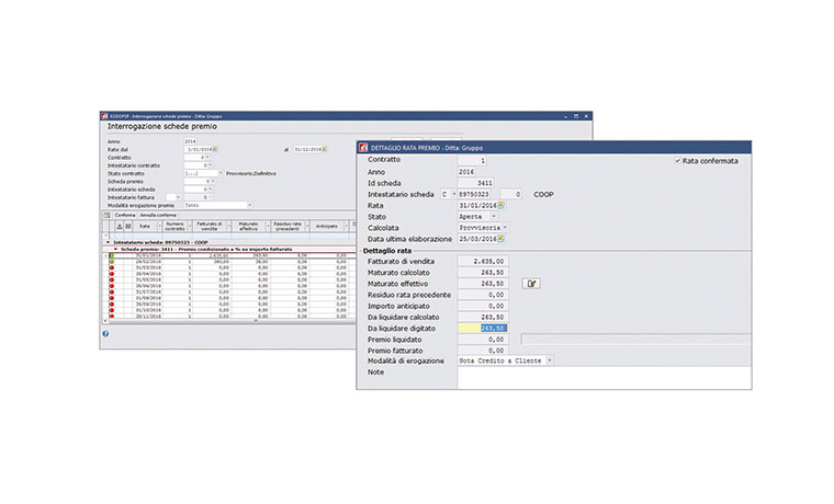 Specifiche schede premio elaborate per ciascun beneficiario del premio, permettono il controllo e l’analisi del fatturato di vendita e della situazione dei premi maturati con il dettaglio di rate non liquidate, importi anticipati, premi liquidati e fatturati.