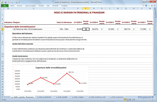 L’analisi elabora indicatori e margini che forniscono importanti informazioni sulla solidità economica dell’azienda, sul rendimento della gestione ma anche sulla struttura degli investimenti e dei finanziamenti. Tali indicatori sono, in generale indici patrimoniali e finanziari, ma anche di redditività, produttività, rotazione, liquidità e sviluppo. In riferimento a ciascuno di essi vengono riportati: